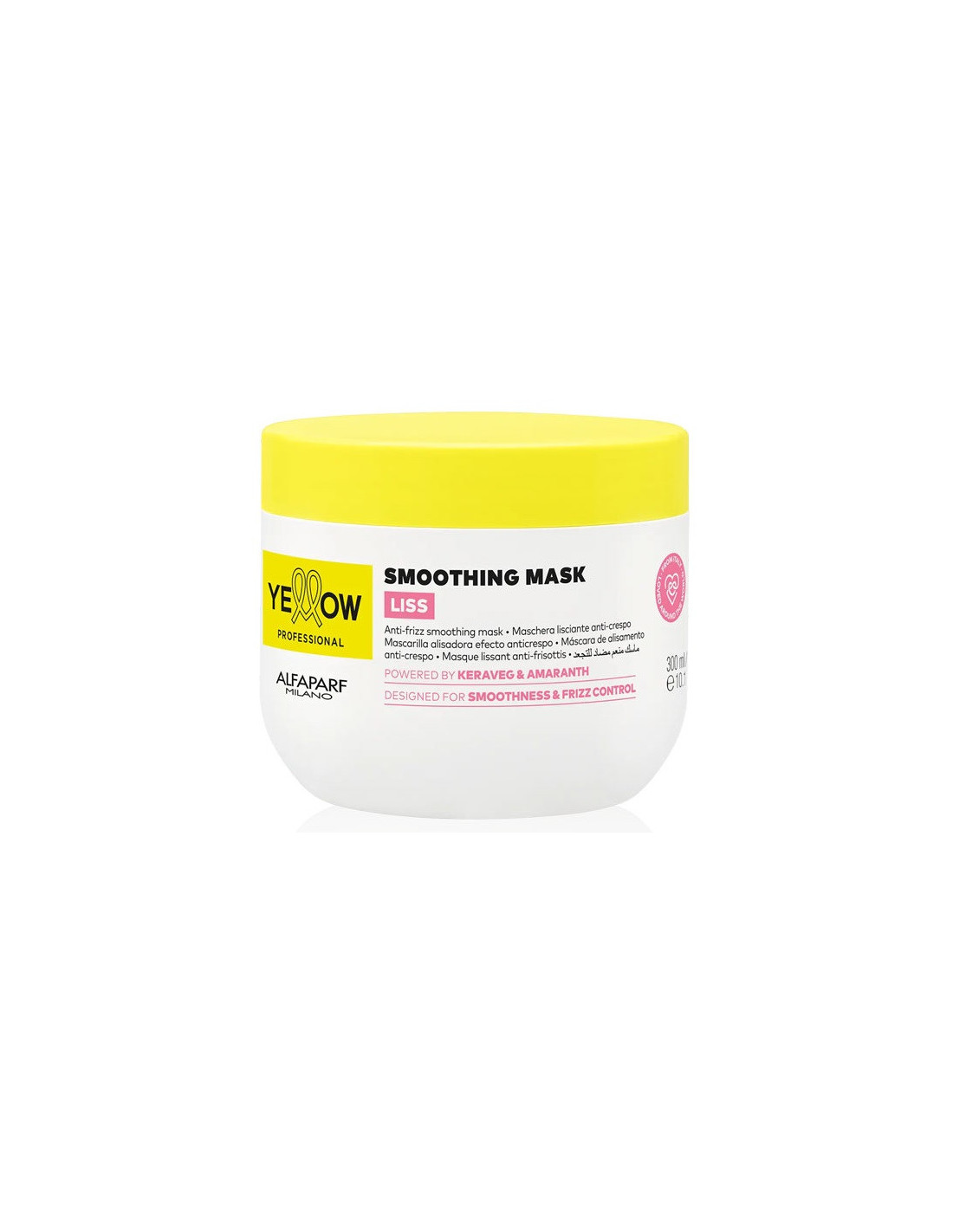 Masken er ideel til uregerligt, glat, kruset eller keratin-glattet hår. Masken nærer og fugter håret i dybden, udglatter hårstrukturen, forhindrer krus, giver håret elasticitet, silkeblødhed, blødhed og glans. Formlen er beriget med: - KeraVeg-kompleks med plantebaserede soja- og hvedeaminosyrer, som har en antioxidant effekt. Komplekset erstatter animalsk keratin og opretholder samtidig effektiviteten af LISS-formlen, beskytter håret mod skader og hjælper med at genoprette hårfibrene. - Aloetrix-kompleks med aloe vera, hvedeproteiner og UV-filtre fugter håret, gør håret lettere at rede og beskytter det ydre lag af hårstrukturen. - Amarantholie, som indeholder blødgørende midler, proteiner, mineraler og E-vitamin, nærer håret i dybden og danner et tyndt lag omkring håret, der fungerer som en stærk barriere og forhindrer fugt i at trænge ind i hårstrået, hvilket giver langvarig beskyttelse. BRUG: Efter YELLOW LISS udglattende shampoo påføres masken i fugtigt hår, og fordeles jævnt i hårets længde og spidser. Lad masken virke i 5 minutter, og skyl derefter grundigt. For en bedre anti-frizz-effekt påføres YELLOW LISS MULTI-ACTION leave-in serum 10-i-1 i håret.