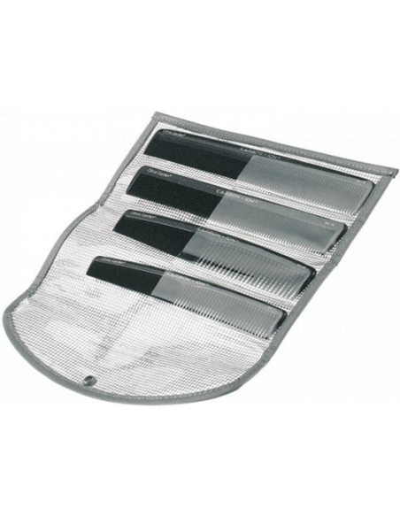 Et sæt med 4 kulstof- og ioniske hårklipkamme. Sættet indeholder: Kam nr. S1. Kam nr. S2. Kam nr. S3. Kam nr. S4. Kulstofkamme har flere fremragende egenskaber, der gør dem af meget høj kvalitet. Dette materiale er meget holdbart og næsten ubrydeligt. Kamme lavet af dette materiale er varmebestandige op til 220 °C. I betragtning af disse kammes holdbarhed er de meget lette. Ionisk teknologi reducerer statisk elektricitet i håret. Hvert hårs kutikula lukker sig, og dermed tørrer håret ikke ud. Dette gør håret skinnende og nemt at style. Kammene er designet til hyppig hårtørring samt til brug med forskellige typer udstyr. Kamtænderne er omhyggeligt afrundede, hvilket giver stimulering og beskyttelse af hovedbunden. Det hjælper også med at forbedre blodcirkulationen i hovedet, fremmer hårvækst og forhindrer hårtab. Hårklipkamme har sektioner til mere præcis klipning.