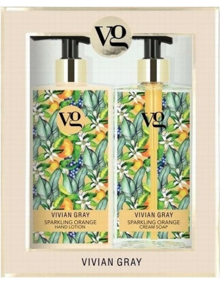 VIVIAN GRAY Sparkling Orange håndplejesæt. Sættet indeholder: plejende cremesæbe + fugtgivende lotion. Forkæl dig selv og dine kære med det perfekte Vivian Gray Sensational kosmetiksæt! Produkterne har en behagelig citrus-, blomster- og appelsinaroma, fugter og nærer huden og gør den blød. Det ideelle sæt som gave. Anvendelse: Brug hvert produkt i kosmetiksættet i henhold til anvisningerne på etiketten.
