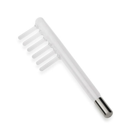 Glaselektrode til darsonval. Elektroden fyldt med argon udsender en violet farve. Den kamformede elektrode bruges til at fremme hårvækst, reducere hårtab osv.