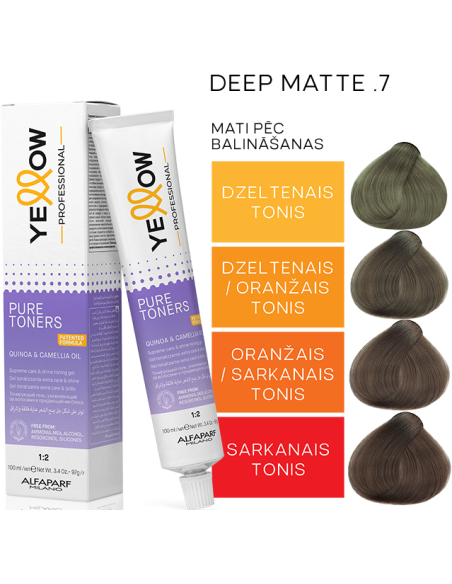 YELLOW PURE TONERS - professionel, toningsmiddel for hår med en plejende effekt. Hårfarven har en gellignende tekstur. Blandingen af ​​hårfarve og oxidant er nem at påføre i håret, men blandingens gennemsigtighed gør det nemt at kontrollere hårfarvningsprocessen. Hårfarven er ideel til farvning af afbleget eller naturligt blondt hår, samt til at genoprette hårtonen mellem hårfarvninger. YELLOW PURE TONERS - for særligt skinnende og langvarige hårfarvningsresultater med en "wow"-effekt. Hårfarven giver professionelle resultater: dækker håret jævnt, giver fremragende hårfarvningsresultater, fugter håret og giver håret glans.