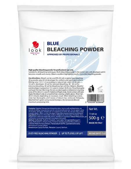 LOOK Salon Concept blåt afblegningspulver er et professionelt produkt af høj kvalitet til præcis og effektiv lysning af hår. Den støvfri formel sikrer renere og mere sikker anvendelse samt op til 7 niveauers lysning. Den blå pigmentering neutraliserer uønskede varme toner og gør produktet ideelt til helafblegning, striber og balayage.