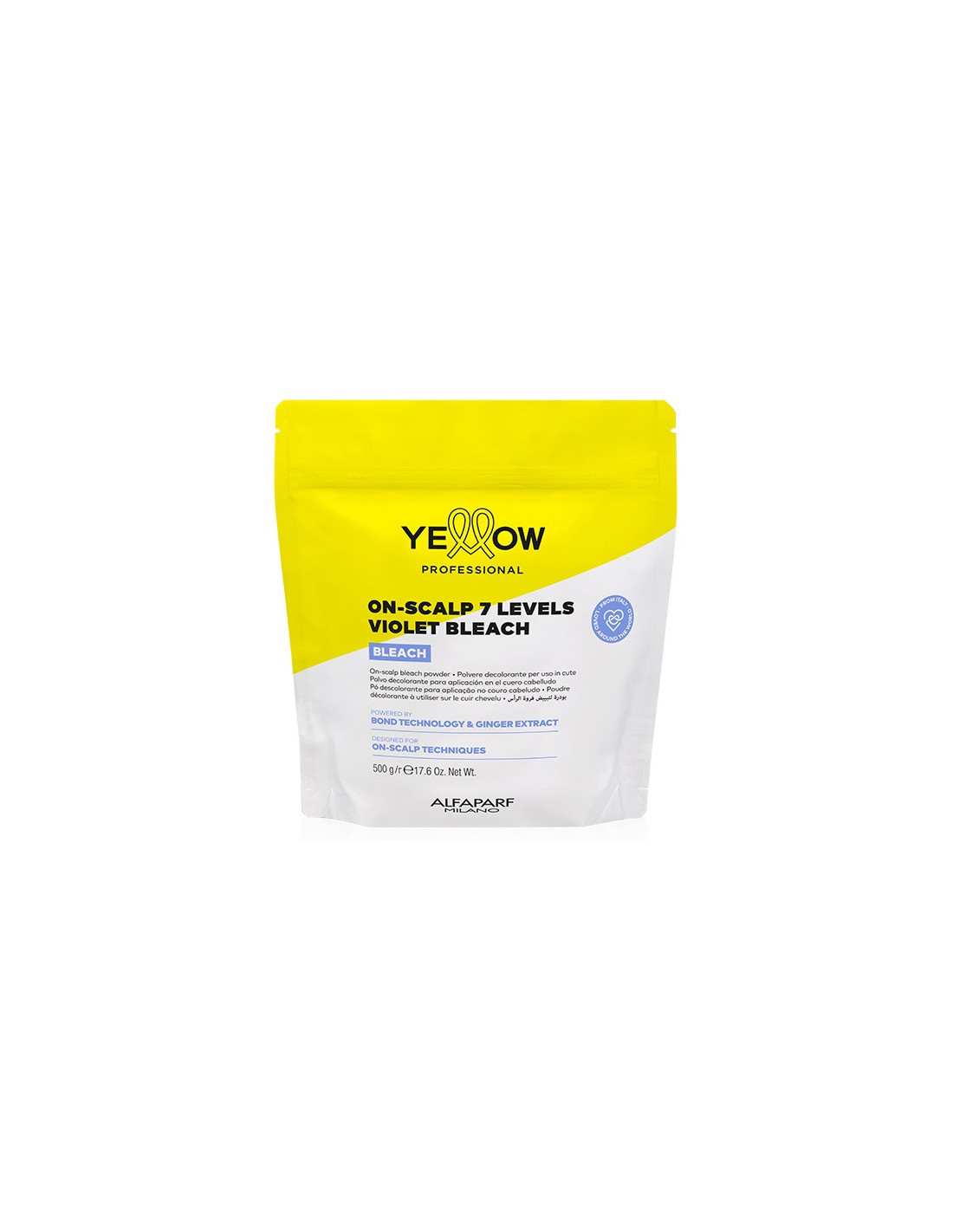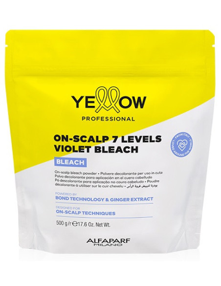 Maksimal effektiv, skånsom pudder til hårstruktur og hovedbund til hårrødderneblegning op til 7 niveauer. Pudderet indeholder violet pigment for Anti-Yellow-effekten mod gule toner i hårtonen for at opnå perfekt rene resultater og den køligeste hårtone. Pudderet lysner effektivt hårrødderne, gør hårrødderne lysere med 7 toner og bevarer hårstrukturens integritet under blegning. Pudderet er især velegnet til følsom hovedbund og giver komfort og en skånsom effekt på håret under blegning. Pudderet er beregnet til blegningsteknikker, hvor blegningsblandingen kan påføres direkte på hårrødderne, meget tæt på hovedbunden for præcise og smukke resultater. Pudderet kan blandes med YELLOW Professional oxidant, ikke stærkere end 6% (20 vol.). Resultatet er en cremet blanding, der er nem, hurtig og tilstrækkelig præcis at påføre på hårrødderne. Kun til professionel brug. Pudderformlen er beriget med: - ingefærekstrakt, som har beroligende og rensende egenskaber, balancerer hovedbunden; - bindingskompleks med keratin, som forbedrer de fysiske egenskaber i skadet hår og hjælper med at styrke hårstrukturen; - Aloetrix-komplekset, som indeholder aloe-ekstrakt, hvedeprotein og UV-filtre, fugter håret effektivt, giver det silkeblødhed, letter udredningen og beskytter hårets struktur under blegning. BRUG: Bland 1 del ON-SCALP BLEACH-pulver med 1 del YELLOW Professional oxidant, ikke stærkere end 6% (20 vol.), i en ikke-metallisk beholder. Blandingsforhold - 1:1 (se brugsanvisningen). Bland pulver- og oxidantblandingen med en børste, indtil der opnås en homogen pasta, og påfør i tørt, uvasket hår. Lad det virke i højst 50 minutter. Kontroller regelmæssigt blegningsgraden. Skyl derefter grundigt og vask håret med shampoo. MÅ IKKE BRUGES UNDER VARME!