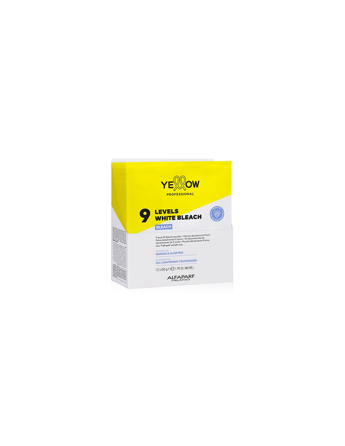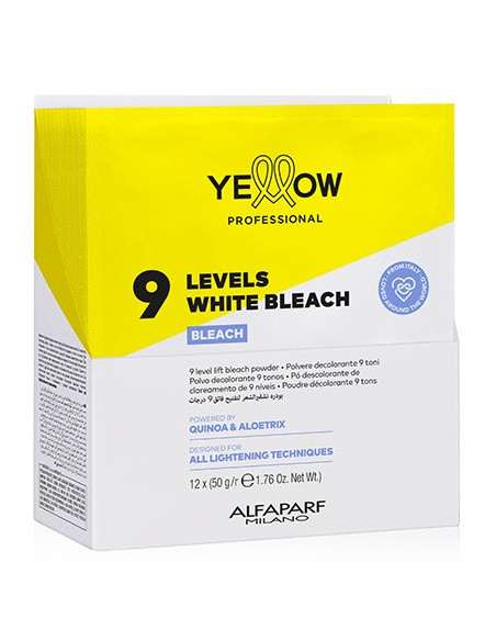 Maksimal effektiv, skånsom blegeformel til hårstrukturen. Pulveret indeholder ikke pigmenter, lysner håret effektivt, gør håret lysere med 9 toner og bevarer hårstrukturens integritet under blegning. Velegnet til alle hårblegningsteknikker. Pulveret har en homogen og ikke-flygtig tekstur uden støv. Pulveret blandes let med YELLOW Professional TECH+ PEROXIDE oxidanter. Resultatet er en cremet konsistensblanding, der nemt, hurtigt og præcist kan påføres håret. Blandingen af pulver og oxidant dækker håret jævnt, er skånsom mod hovedbunden og hårstrukturen og giver dig mulighed for at opnå de mest effektive resultater. Kun til professionel brug. Pulverformlen er beriget med: - quinoafrøekstrakt, som hjælper med at bevare keratinbindinger i hårstrukturen; - Aloetrix-komplekset, som indeholder aloe vera-ekstrakt, hvedeprotein og UV-filtre, fugter håret effektivt, giver håret silkeblødhed og beskytter hårstrukturens integritet under blegning. BRUG: Bland 9 LEVELS WHITE BLEACH-pulver med YELLOW Professional oxidant i en ikke-metallisk beholder. Blandingsforhold - fra 1:1,5 til 1:2 (se brugsanvisningen). Bland blandingen med en børste, indtil der opnås en homogen pasta, og påfør i tørt, uvasket hår. Lad det virke i højst 50 minutter, og skyl derefter grundigt og vask håret med shampoo. Hvis blegeteknikken involverer påføring af blegemiddel i hovedbunden, må pulveret ikke blandes med et oxidationsmiddel, der er stærkere end 6% (20 vol.). MÅ IKKE BRUGES UNDER VARME!